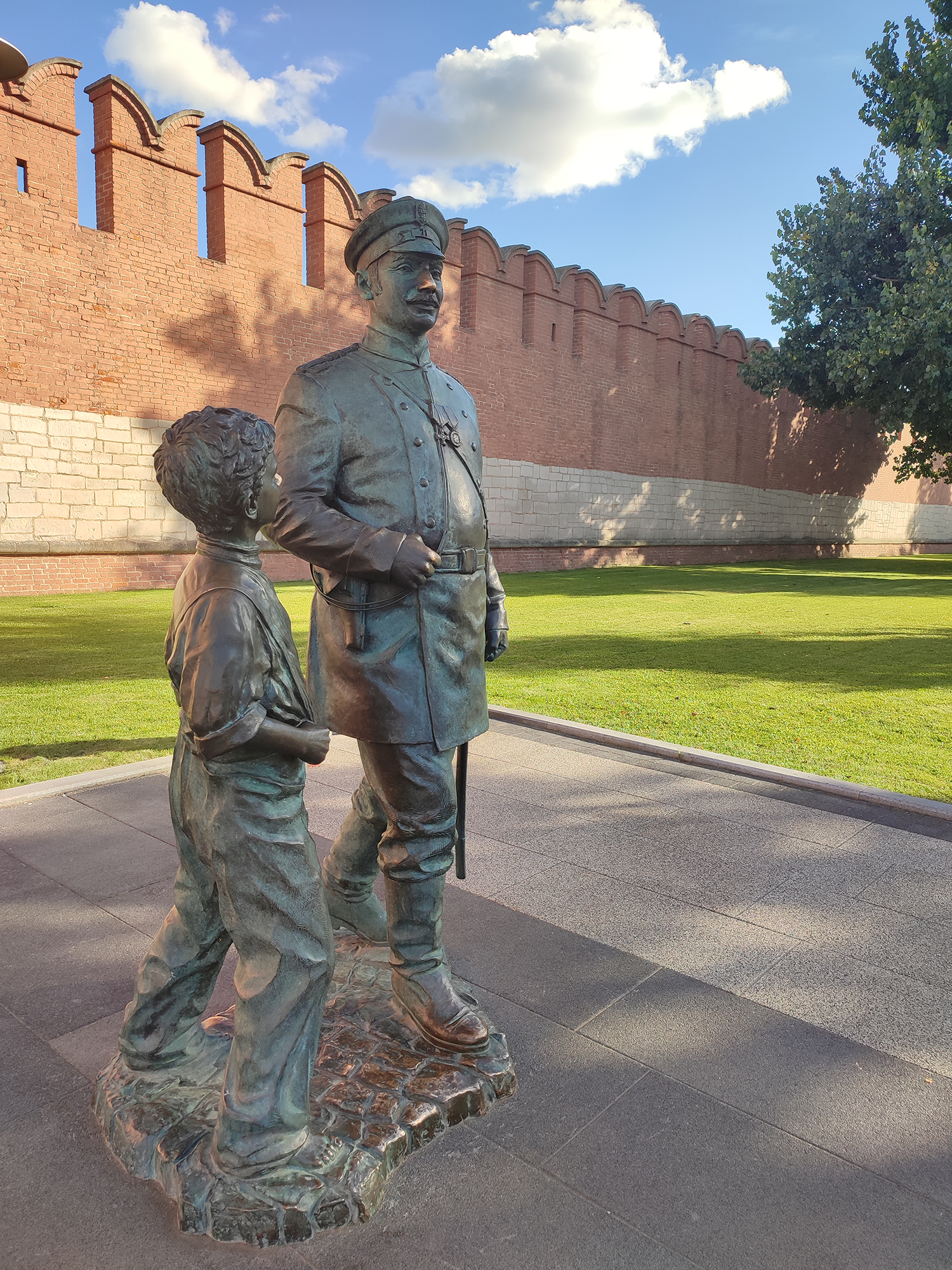 К 300-летию российской полиции 30 мая 2018 года в Туле установили памятник тульскому городовому. Бронзовая композиция состоит из двух фигур: городового в полном обмундировании и десятилетнего мальчика, который с восхищением смотрит на стража порядка. Автор скульптуры — Марина Логунова. Чтобы создать исторически достоверный образ, она изучала фотографии и рисунки начала XX века, консультировалась с музейными экспертами и даже сшила настоящий китель для позировавших моделей.